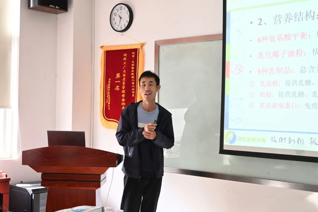集团预混料产品师杨立军详细向各位客户介绍了产品的生产工艺、产品的FABE和产品原料组成,每个产品和产品组合在终端生产性能的表达信手拈来,同时也认真解答了客户们的疑惑,并根据不同的品种、不同的行情和饲喂阶段制定产品饲喂模式。